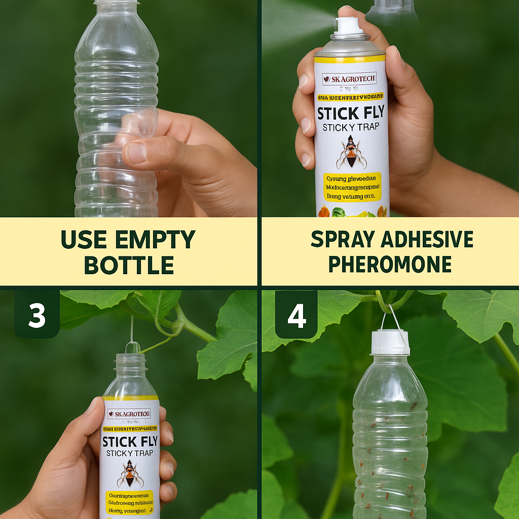 SK Agrotech Fruit Fly Sticky Aerosol Spray is a ready-to-use attractant-based sticky spray designed to control fruit flies and melon flies in fruits and vegetables. When sprayed on bottles or trap surfaces, it attracts and traps flies effectively, helping farmers reduce crop damage in an eco-friendly way.